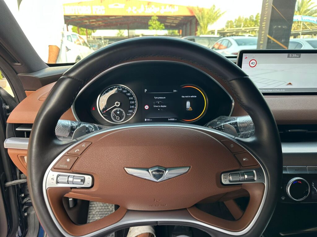 التصميم الخارجي: أناقة لا تضاهى مع الشبك الأمامي المميز لعلامة جينيسيس وإضاءة الـ LED الرباعية التي تمنح السيارة هيبة وحضوراً لافتاً على الطريق.